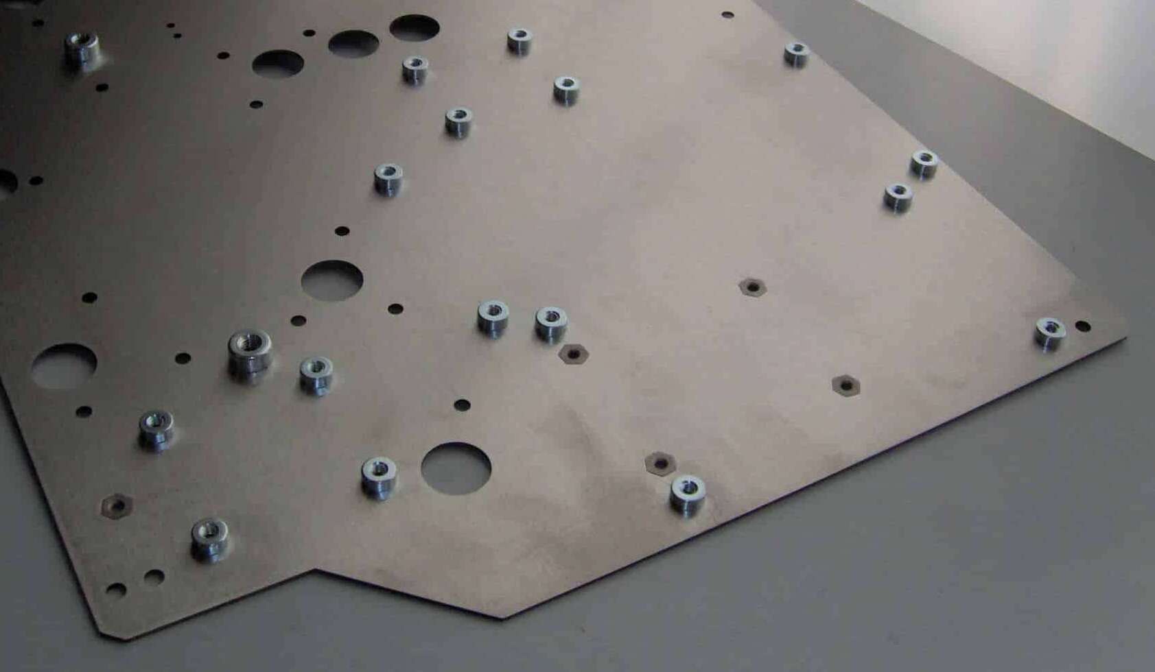 Tramite le presse insertatrici idrauliche del nostro reparto assemblaggio applichiamo internamente gli inserti autoaggancianti per lamiere tipici del campo della carpenteria leggera per elettronica. I sistemi di fissaggio vengono applicati alla lamiera in via permanente, andando ad autocentrarsi nei pre-fori dedicati, realizzati durante la precedente fase di taglio.